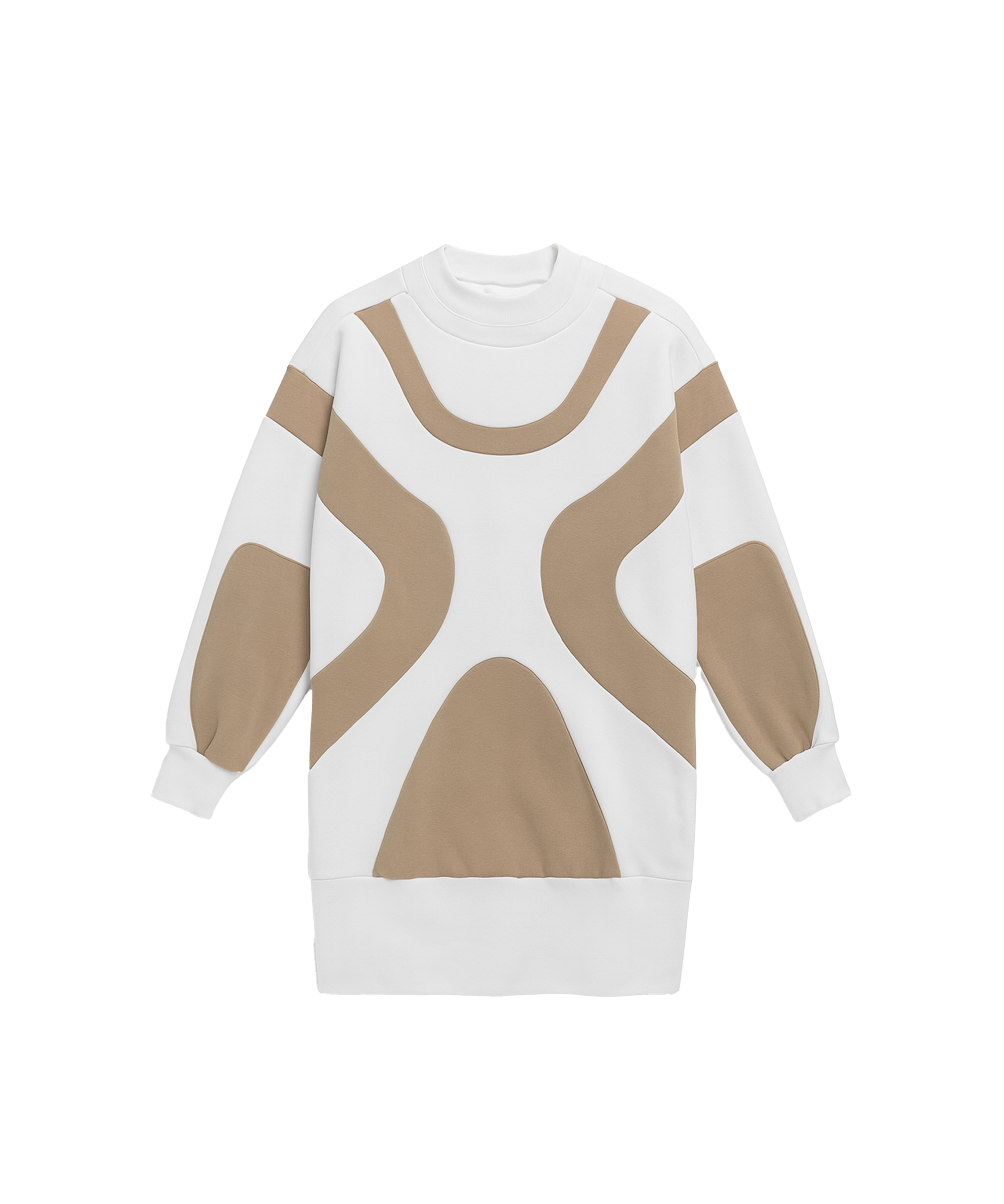 Tauche ein in futuristisches Streetwear-Design mit unserem Orbit Sweater Dress. Das lang geschnittene Sweaterkleid verbindet minimalistischen Komfort mit auffälligem, organischem Pattern. Die kontrastierenden Sand-Töne und geschwungenen Linien verleihen dem Kleid eine einzigartige, energische Silhouette und sorgen für einen echten Statement-Look.